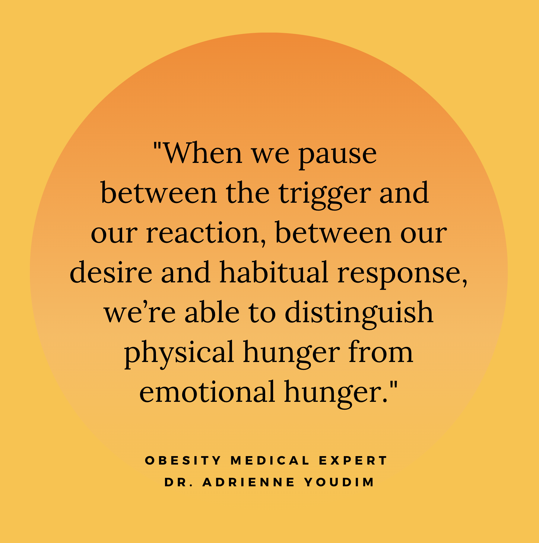 “Our hunger represents our unmet emotional and spiritual needs. We hunger for connection and belonging, for validation and self compassion. When those hungers go unmet we experience difficult emotions like sadness, anger, boredom, and frustration, that we then soothe with smoking, drinking, overworking, shopping, gambling and yes, food. The science backs this up.”